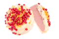Een lichtrode basis, gevuld met witte chocoladepasta, gemend met framboosparels en afgetopt met witte chocolade. De bar voor iedere liefhebbers van raspberry choco.