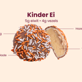 Suiker,wei-eiwit concentraat, tapioca vezel, vollemelkpoeder, cacaoboter, plantaardige olie (zonnebloem, palm),bevochtigingsmiddel: glycerol, cacaomassa,hazelnoten, magerecacaopoeder,weipoeder,lactose, mageremelkpoeder, geheelgehard vet (koolzaad), glucosestroop, emulgatoren: lecithine(zonnebloem,soja), citroenzure esters van mono- en diglyceriden vanvetzuren, glansmiddel: bijenwas, kleurstoffen: curcumine, karmijn,natuurlijke aroma’s, natuurlijk vanille-extract.