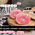 Een echte traktatie! Een lichte vanillebasis, afgetopt met cream cheese, daarop kersen, omhuld met witte chocolade en bestrooid met speculoos kruimels. Het is net een Monchou taart, maar dan in barvorm!